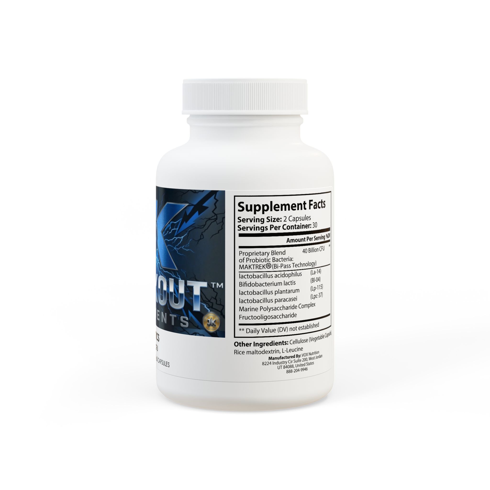 Ingredients: Proprietary Blend 40 Billion CFU of Probiotic Bacteria: MAKTREK (Bi-Pass Technology), lactobacillus acidophilus (La-14), Bidobacterium lactis (Bl-04), lactobacillus plantarum (Lp-115), lactobacillus paracasei (Lpc-37), Marine Polysaccharide Complex, Fructooligosaccharide ®. Other Ingredients: Cellulose (Vegetable Capsule), Rice maltodextrin, L-Leucine