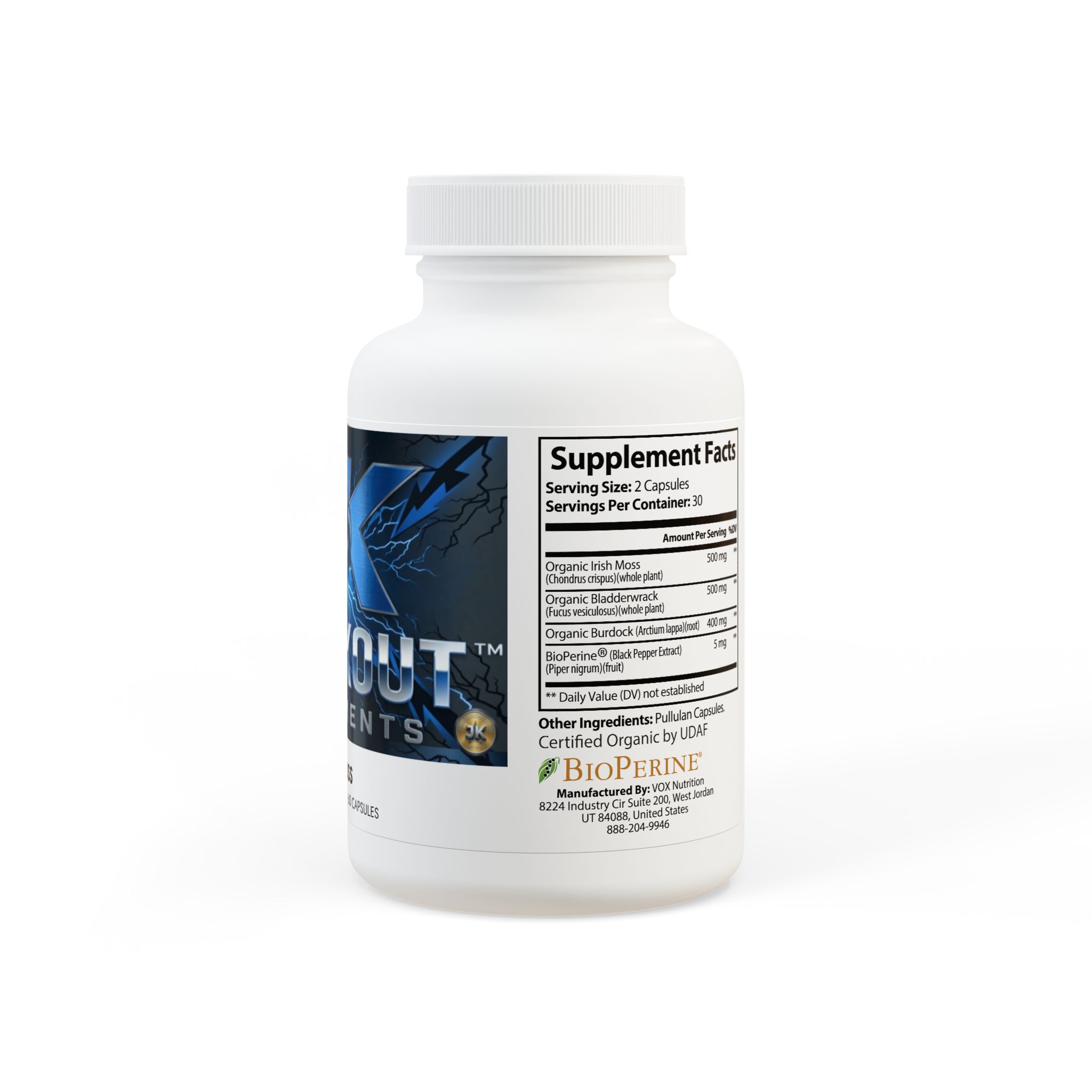 Ingredients: Organic Irish Moss (Chondrus crispus)(whole plant), Organic Burdock (Arctium lappa)(root), Organic Bladderwrack (Fucus vesiculosus)(whole plant), BioPerine® (Black Pepper Extract), (Piper nigrum)(fruit). Other Ingredients: Pullulan Capsules.